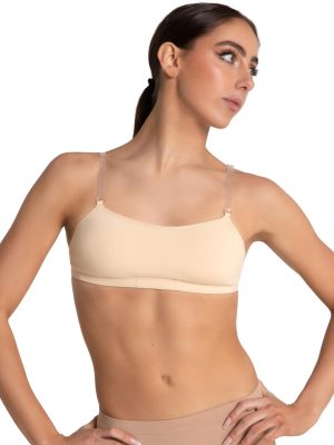 The Camisole Bra with Bratek® is a flawless foundation under costumes. Adjustable shoulder and back straps are clear to avoid outfit clashing when layering dancewear. Built-in Bratek® provides comfortable. anatomic contouring and cup support. Recommended for every dancer who calls for a bit of reinforcement. Available in adult sizes only.